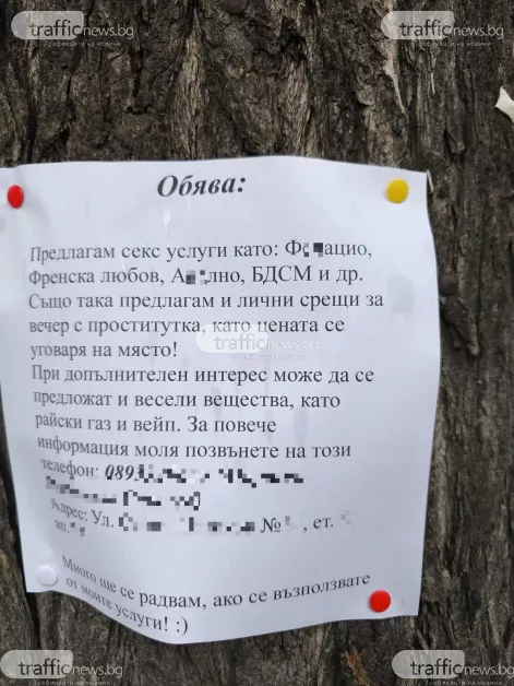 Странна обява се появи в района на училище „Душо Хаджидеков“ в Пловдив и моментално привлече вниманието на родителите и минувачите. По дърветата бяха разлепени листовки с името и телефонния номер на младежа, който предлага различни… секс услуги. На листовките имаше и „допълнителни забавления“ с препратка към забранени вещества, предназначени да увеличат удоволствието, както беше написано.