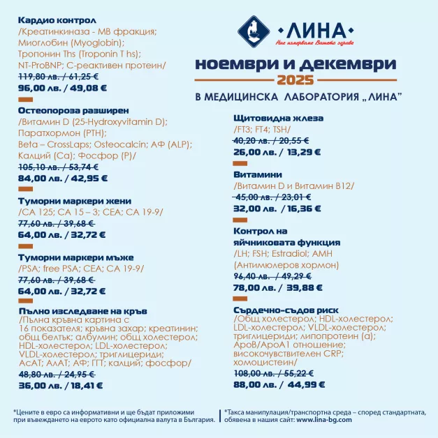 Грижата за здравето започва с навременната профилактика. Затова през ноември и декември 2025 г. медицинска лаборатория „ЛИНА“ прави важни анализи по-достъпни за пациентите. Сред тях са пълно изследване на кръв, хормони за щитовидна жлеза, пакети за репродуктивно и сърдечно-съдово здраве, туморни маркери, витамини и др.