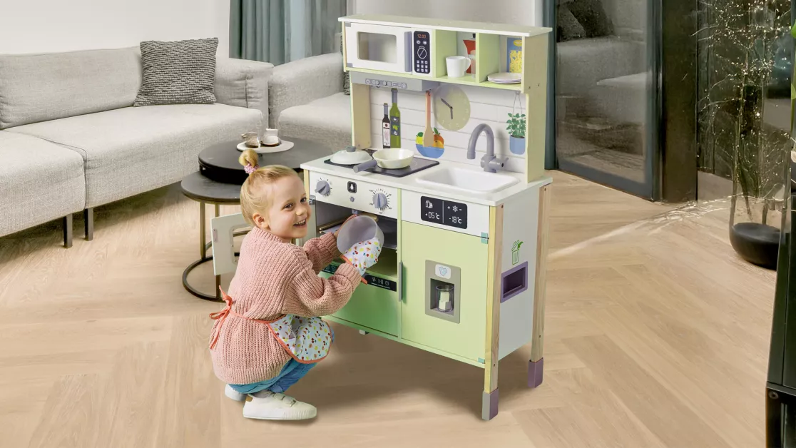 Хитът в тазгодишната колекция е Дървеният кухненски бокс за игра (99,99 лв.), който е снабден със звукови и светлинни ефекти, има опция за регулиране на височината и разполага с фурна и котлони. Той е „черешката на тортата“ за всяка детска стая.