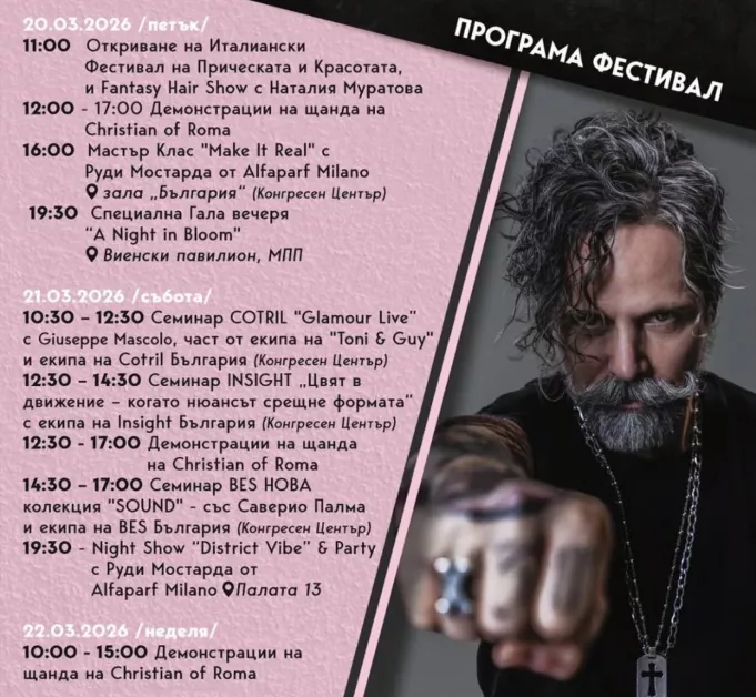 Първият ден ще започне с Fantasy Hair Show на Наталия Муратова – световен и абсолютен европейски шампион по фризьорство, известна със своите артистични трансформации, сложни вечерни визии и майсторство в детайла. След откриването ще последват демонстрации на щанда на Christian of Roma, а от 16:00 часа в зала „България“ ще започне Masterclass „Make it real“ с Руди Мостарда – обучение, посветено на съвременните техники за подстригване и боядисване, съчетани с ясен и практически приложим метод на работа.