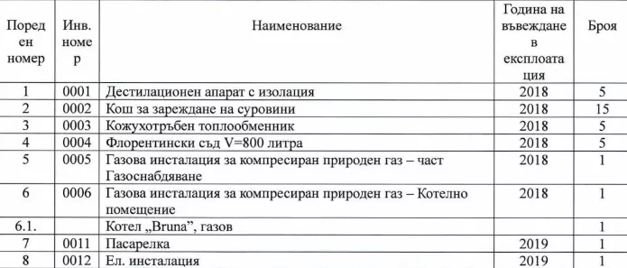 В продажбата влиза и пълно оборудване за производствен процес, включително дестилационни апарати, топлообменници, флорентински съдове, газова инсталация с котел, електрическа инсталация и технологични съоръжения, въведени в експлоатация основно през 2018–2019 г. По оценката на съдебния изпълнител движимото имущество струва 217 728 лв., а недвижимият имот – 155 880 лв.