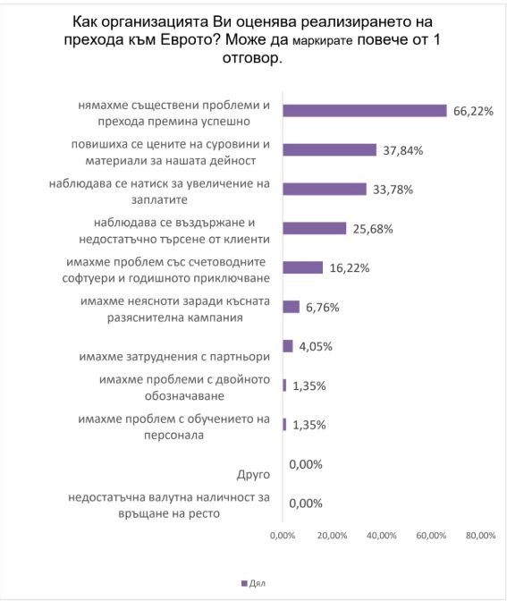 Бизнесът се справя успешно, но отчита нови предизвикателства. Според данните от анкетата, внушителните 66,22% от компаниите категорично заявяват, че не са имали съществени проблеми и преходът е преминал успешно. Възникналите казуси са били предимно моментни и решими – свързани основно с обучения на персонала и притеснения за първия месец на двойно обращение на валутите.