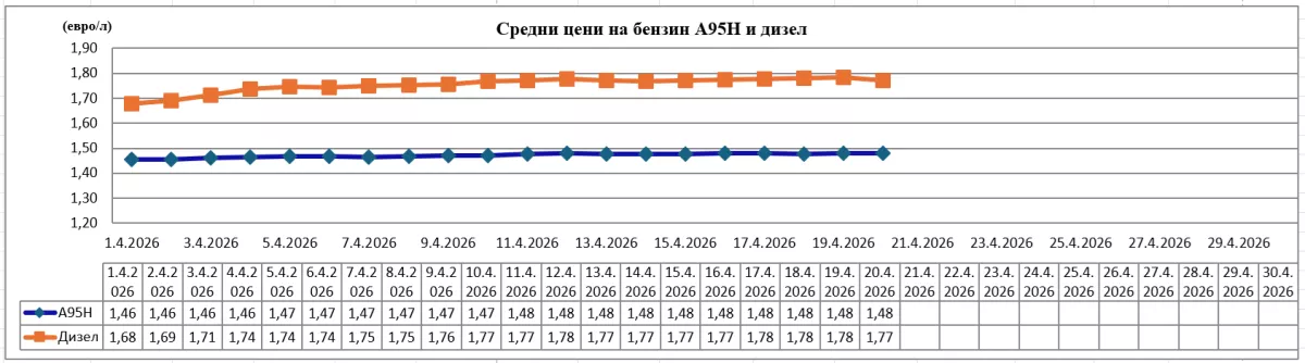 В България тенденцията също е силно възходяща, като официалните ежедневни данни на Националната агенция за приходите (НАП) за месец април 2026 г. показват ясно разтваряне на ценовата ножица между масовите горива. Докато бензин А95 запазва относителна стабилност през целия месец, колебаейки се в тесните граници между 1,46 и 1,48 евро за литър, дизелът бележи постоянен ръст, стартирайки от 1,68 евро на 1 април и достигайки пик от 1,78 евро през втората половина на месеца. Тъй като цените на дизела трайно преминаха заложения в закона праг от 1,60 евро за повече от три последователни дни, това на практика изпълнява условията за активиране на държавната програма за компенсиране на уязвимите физически лица с 20 евро месечно, която цели да смекчи транспортния шок от увеличените цени след конфликта в Близкия изток.