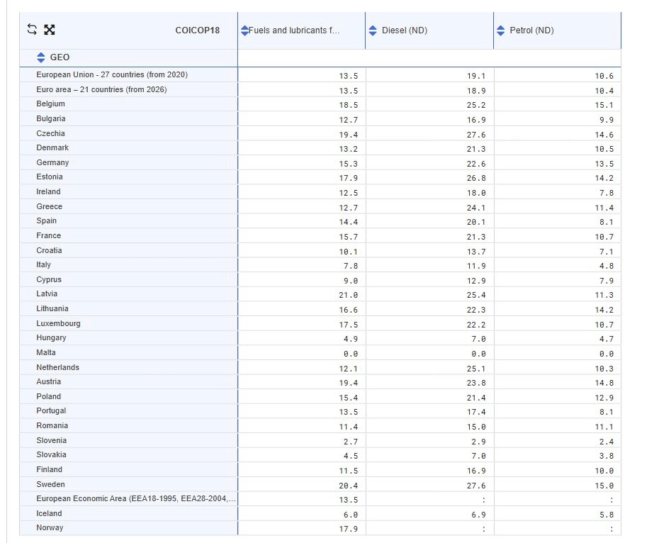 По данни на Евростат през март 2026 г. цената на горивата и смазочните материали в ЕС се е повишила средно с 12.9% в сравнение със същия месец на предходната година. Почти всички държави членки отчитат ръст, като най-сериозен удар по джоба понасят шофьорите в Германия (+19.8%), Румъния (+19.6%), Нидерландия (+18.8%), Латвия (+18.5%) и Австрия (+17.2%).