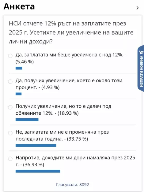 За да разберем, проведохме анкета сред читателите на TrafficNews със следния въпрос: "НСИ отчете 12% ръст на заплатите през 2025 г. Усетихте ли увеличение на вашите лични доходи?".