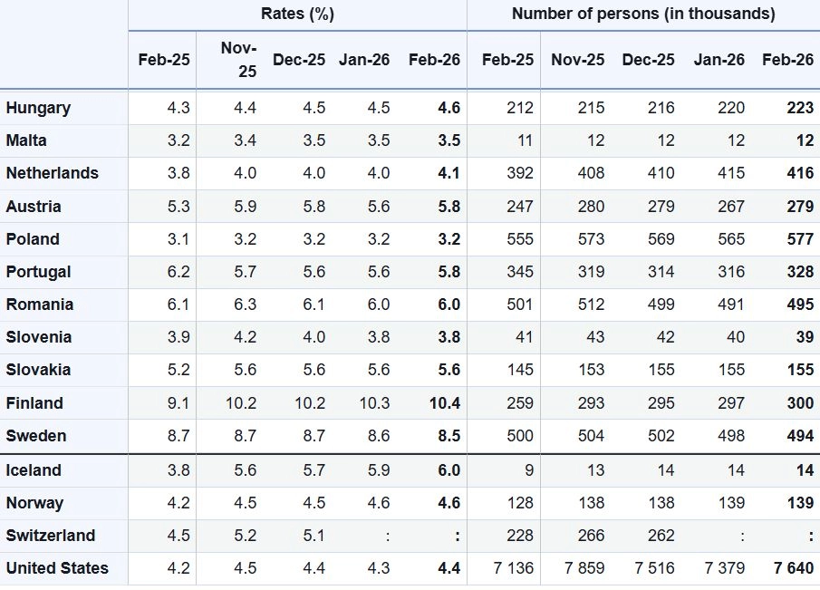 Макар това да представлява минимално покачване спрямо януари 2026 г. (когато нивото е било 3.1%), данните сочат категоричен спад на годишна база – през февруари 2025 г. безработицата у нас е била 3.5%. В абсолютни цифри, броят на безработните българи е намалял от 107 000 души през февруари миналата година до 96 000 души през февруари 2026 г.. За сравнение, общият брой на хората без работа в целия Европейски съюз надхвърля 13.1 милиона души.