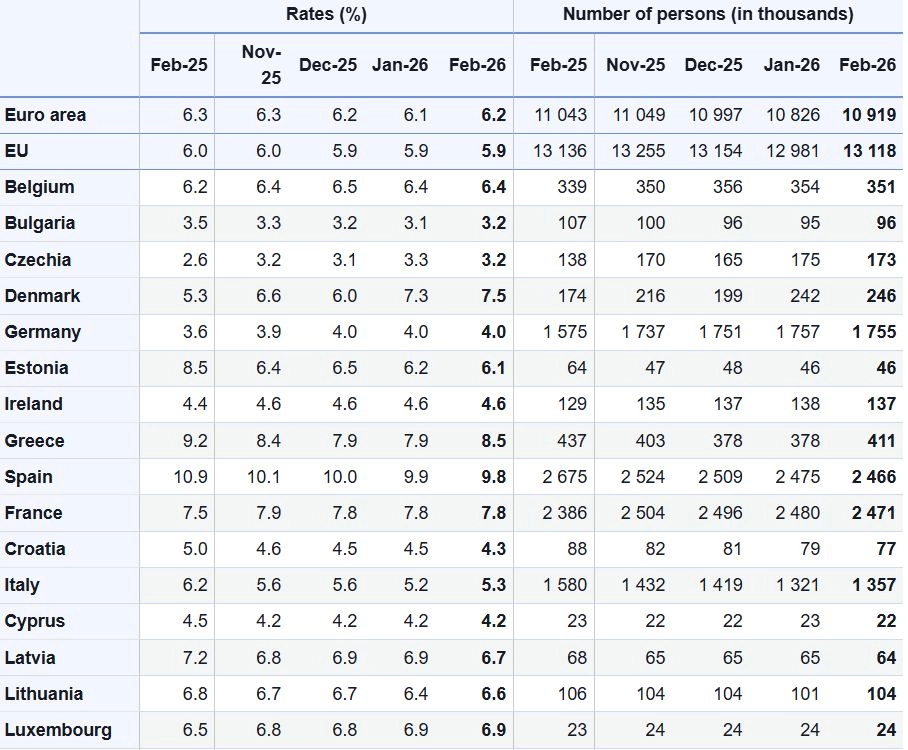 През февруари 2026 г. нивото на безработица в Европейския съюз се запазва на 5.9%, докато в Еврозоната (в която България вече официално фигурира като част от групата EA21) показателят леко се покачва до 6.2%. На този фон, България отчита коефициент на безработица от едва 3.2% за същия месец.