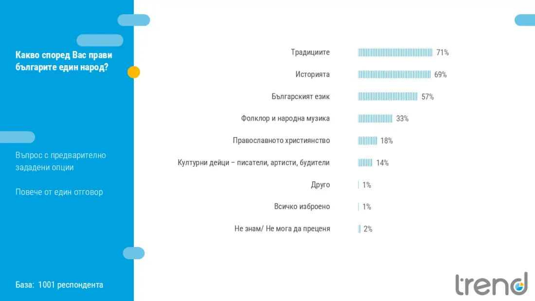 Националната идентичност е силно изразена сред мнозинството от българите, а традициите, историята и езикът остават водещи обединяващи фактори. Това сочи ново социологическо проучване на изследователски център „Тренд“.