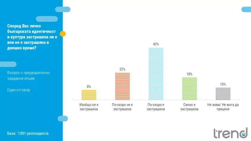 Мнозинството от 60% от българите възприемат известна степен на застрашеност за родната идентичност и култура. От тях 42% смятат културата ни за „по-скоро застрашена“, а 18% я виждат като „силно застрашена“.