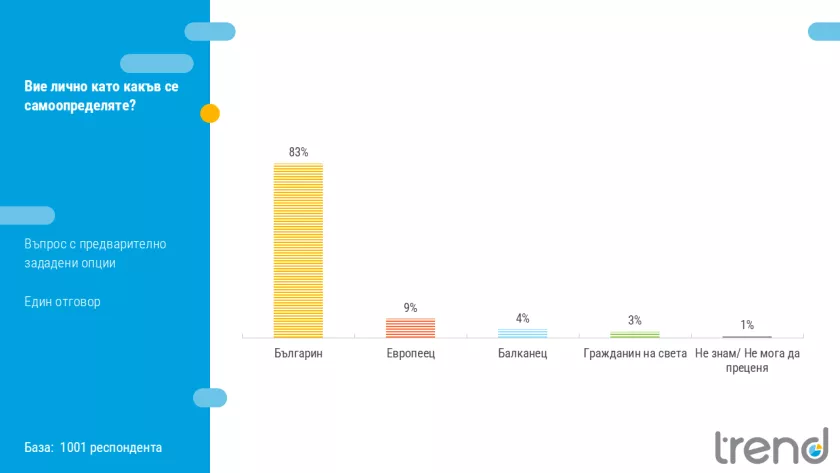 На въпроса „Вие лично като какъв се самоопределяте?“, огромното мнозинство от 83% от анкетираните отговарят просто – „българин“. За сравнение, европейската и глобалната идентичност остават далеч назад: едва 9% се чувстват първо „европейци“, 4% се определят като „балканци“, а скромните 3% – като „граждани на света“.