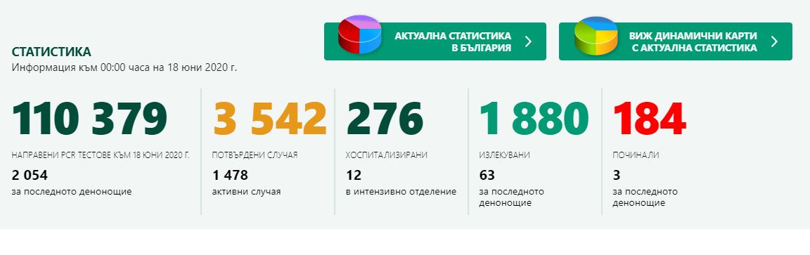 Заразените у нас, според официалната статистика са вече 3542 души, а жертвите на коронавируса са 184. Активните случаи са 1478. Броят на излекуваните до момента е 1880 души. През последното денонощие са регистрирани 63 от тях. За изминалото денонощие за новия коронавирус са изследвани 2054 проби.