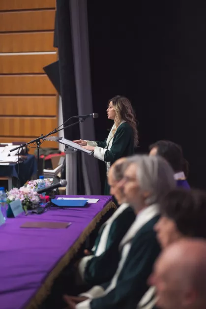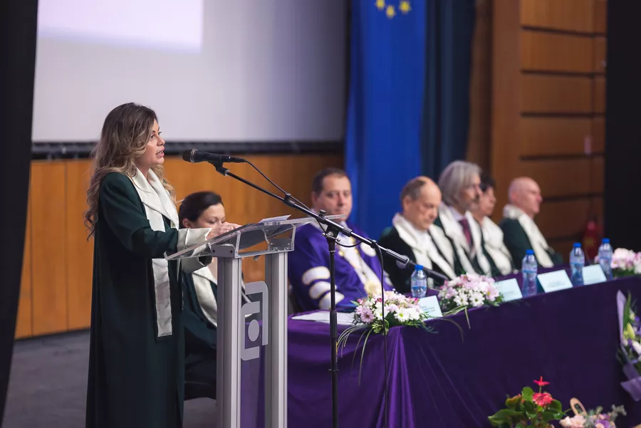 „Да помогаш, да подкрепяш, да лекуваш, да се грижиш, да управляваш, да водиш – това е мисия, която носи огромна отговорност и още по-голяма стойност“, подчерта тя в обръщението си към абсолвентите и ги увери, че успехът от завършването трябва да им носи заслужена увереност и сили за нови постижения.