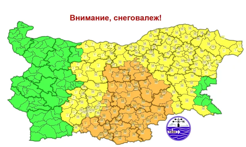 Утре в 13 области от Централна и Източна България и Родопите е издане жълт код за снеговалеж. Шофьорите да тръгват с автомобили, готови за зимни условия, предупреждават от Агенция "Пътна инфраструктура" (АПИ). Кодът е От пътната агенция допълват, че ще има условия за виелици и за образуване на навявания и преспи.