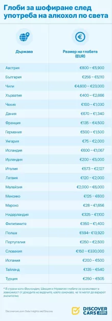 Най-крайната мярка в Европа според таблицата е в Словакия, където глобата може да достигне 330 000 евро. Следват Полша с максимум 13 920 евро, Австрия с до 5900 евро и Ирландия с до 5000 евро. В тази група попада и България, което я нарежда сред държавите с по-тежък наказателен режим за пияни шофьори.