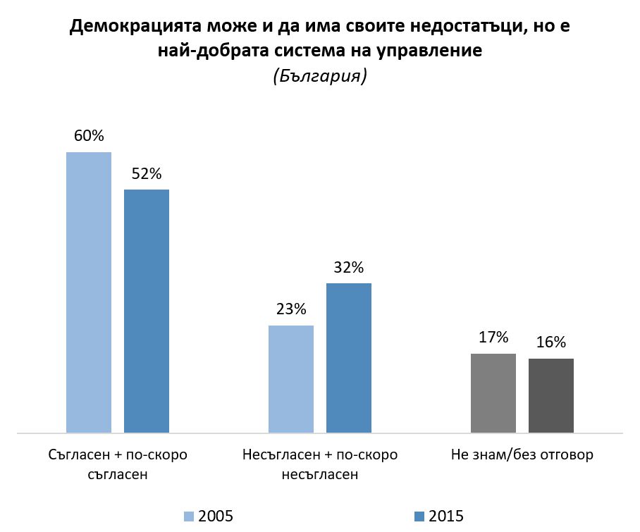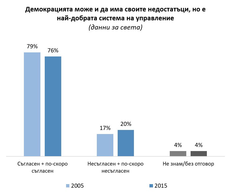 В рамките на десетилетие степента на приемане на демокрацията по света като че ли леко спада - мнозинството, което приема, че това е най-добрата форма на управление, е разколебано от 79% на 76%. В България има сходни белези - от 60%, съгласните спадат за десетилетие до 52%.