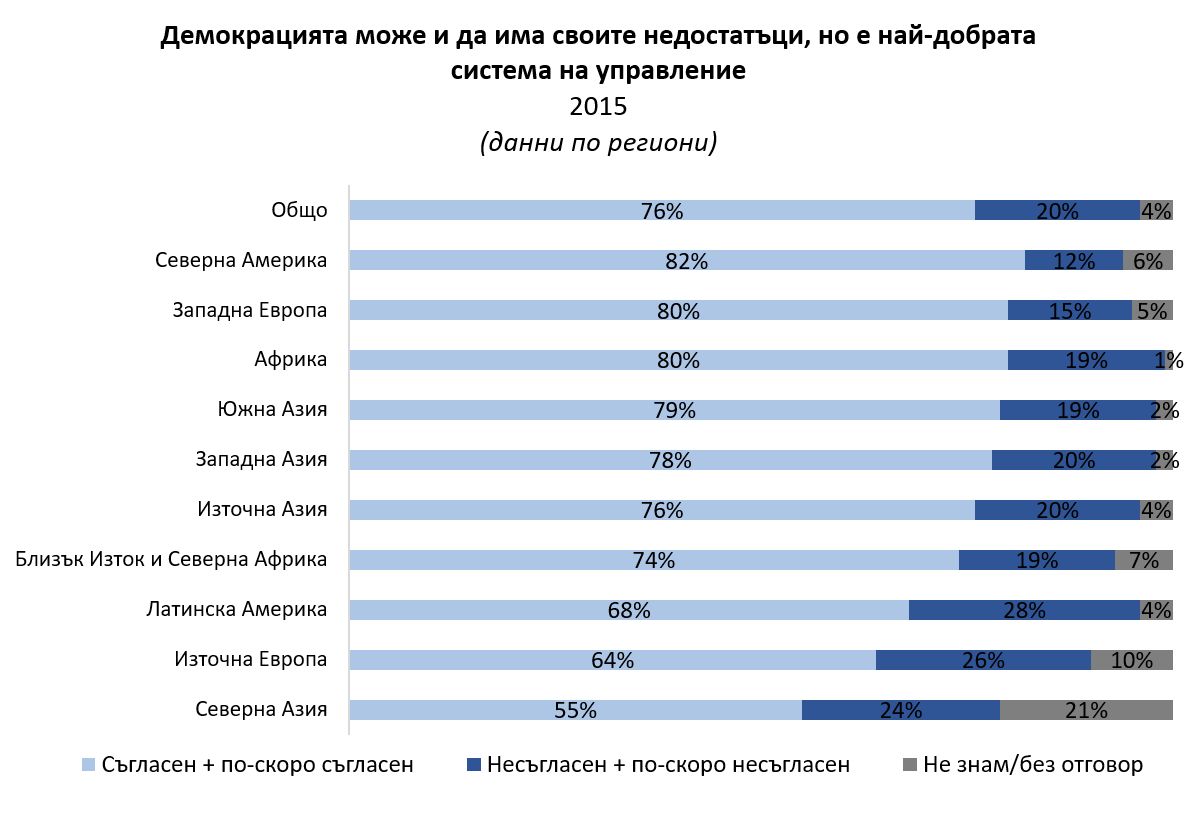 Ако погледнем картината по региони, през 2015 г. демокрацията е най-харесвана - очаквано - в Северна Америка (82% мнозинство съгласно, че демокрацията е най-добра форма на управление) и в Западна Европа (80%). От друга страна, нивата на съгласие с твърдението, че демократичната система е най-добра са най-ниски в Източна Европа (64%) и Северна Азия (55%).