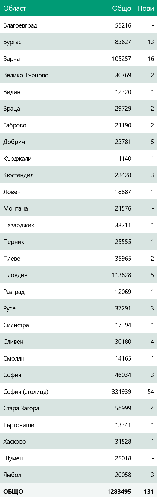 Новозаразени в страната - 131 (51.91% неваксинирани)