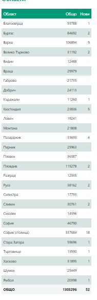 Новозаразени в страната - 52 (65 % неваксинирани)