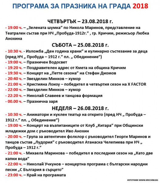 От 19 часа в центъра на града започне празничен водосвет, слово ще произнесе кметът на Община Кричим Атанас Калчев, а по-късно ще се състои и тържествена заря.