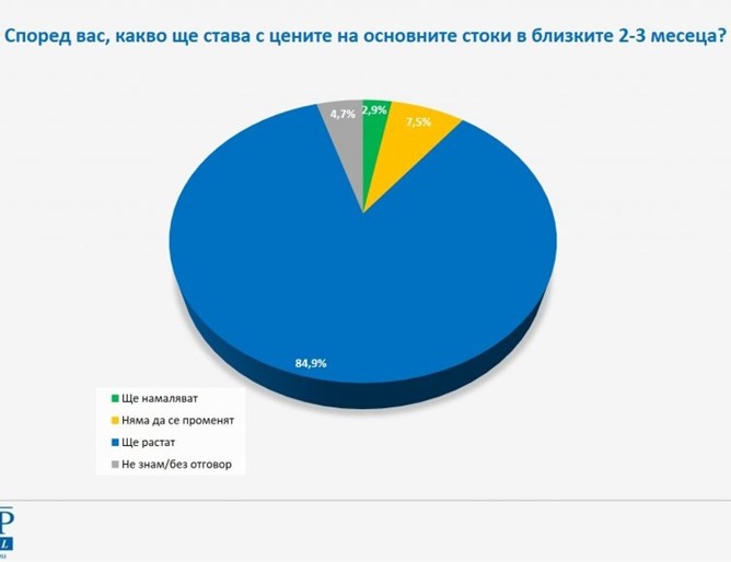 84,9% от пълнолетните българи очакват повишения на цените в следващите месеци, пише 24часа. 7,5% смятат, че цените ще остават същите, а само 2,9% смятат, че те ще падат. Има и малка „сива зона“ – без отговор.
