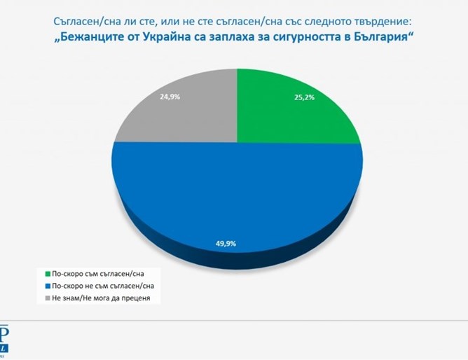 Според данните 49,9% не споделят схващането, че бежанците от Украйна са някаква заплаха за сигурността в България. На обратното мнение са 25,2%, а станалите се колебаят.