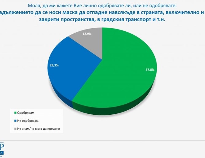 На фона на войната и цените, подходът към коронавируса у нас напоследък среща отчетливо одобрение. 57,8% одобряват повсеместното преминаване на задължителното носене на маски в препоръчително, а 29,3% не го одобряват. Останалите не могат да преценят. Данните показват, че в този специфичен ресор е една от най-силните обществени оценки за текущите политики.