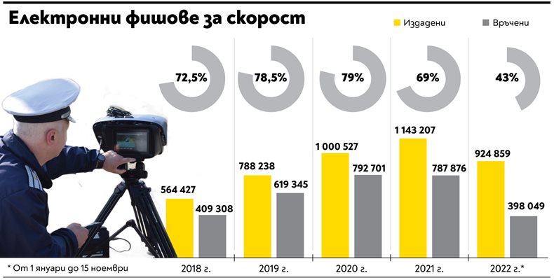 У нас от 930 хиляди електронни фиша за скорост, което е най-масовото нарушение на пътя, издадени от началото на 2022 г. до средата на ноември, са връчени едва 400 хиляди - по-малко от половината.