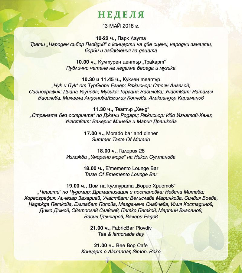 В неделния ден продължава големият Народен събор в парк Лаута, където песни и танци ще се вихрят на две сцени. По същото време в Панаира ще се проведе и спортен фестивал. В 10 часа за пореден път доброволци ще почистват Ботаническата градина, която под техните грижи започна да се възражда.