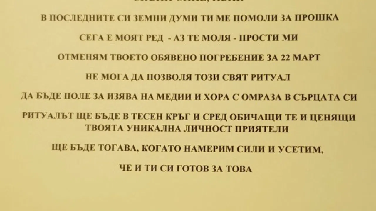 Днес той е споделил снимка на бележка, на която пише: Скъпи сине, Ивик. В последните си земни думи ти ме помоли за прошка. Сега е моят ред - аз те моля, прости ми. Отменям твоето обявено погребение за 22 март. Не мога да позволя този свят ритуал да бъде поле за изява на медии и хора с омраза в сърцата си. Ритуалът ще бъде в тесен кръг и сред обичащите те и ценящи твоята уникална личност приятели. Ще бъде тогава, когато намерим сили и усетим, че и ти си готов за това, пише "24 часа".