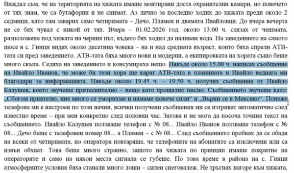 Мъжът се качва на колата и тръгва към чешмата по-надолу от хижата. На шосето имало патрул на гранична полиция. Разказал какво видял и се обадил на 112. През деня съдействал на органите на реда. Доброволно дал да му бъдат взети обтривки от двете ръце. Ивайло Калушев писал и на майка си. Ето и нейните показания: