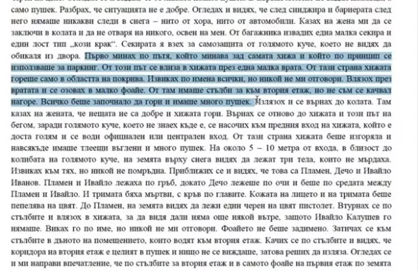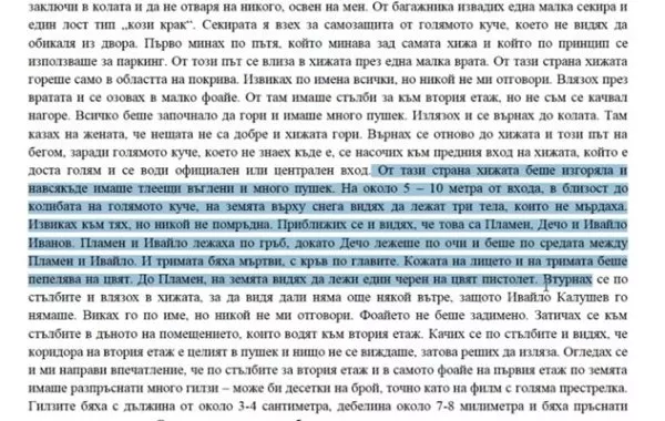 "Първо минах по пътя, който минава зад самата хижа и който се използваше за паркинг. От тази страна хижата гореше само от страната на покрива. Извиках по имена всички, но никой не ми отговори. Насочих се към предния вход на хижата. От тази страна хижата беше изгоряла. Имаше тлеещи въглени и много пушек. На около 5-10 м от входа, в близост до колибата на голямото куче, върху снега, видях да лежат три тела, които не мърдаха. Приближих се и видях, че това са Пламен, Дечо и Ивайло Иванов. Пламен и Ивайло лежаха по гръб, докато Дечо лежеше по очи и беше по средата. И тримата бяха мъртви с кръв до главите. До Пламен на земята видях да лежи един черен на цвят пистолет. Качих се по стълбите и видях, че коридорът на втория етаж е целият в пушек и нищо не се виждаше, затова реших да изляза. Във фоайето на първия етаж по земята имаше разпръснати много гилзи, може би десетки на брой, точно като на филм с голяма престрелка. Гилзите бяха с дължина до 4 см и дебели 7-8 мм и бяха пръснати навсякъде по земята. Според мен гилзите не бяха от патрони за пистолет, а по-дълги и със сигурност по-дебели", сочат показанията на Деян, които разпространи Нова телевизия.