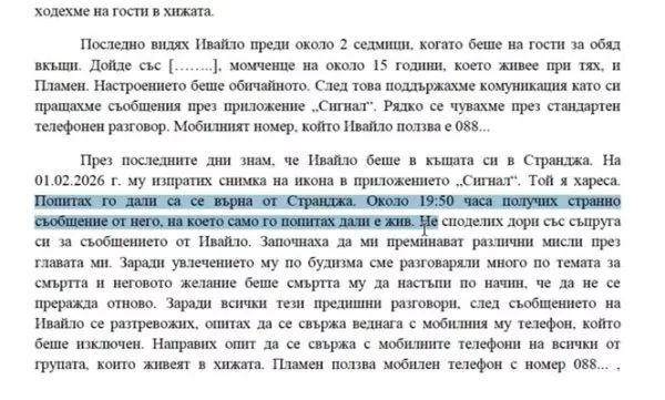 "Попитах го дали се е върнал от Странджа. Около 19:50 получих странно съобщение от него, на което само го попитах дали е жив. Заради увлечението му по будизма сме разговаряли много по темата за смъртта и неговото желание беше смъртта му да настъпи по начин, че да не се преражда отново. Заради всички тези предишни разговори след съобщението на Ивайло се разтревожих. Опитах се да се свържа веднага с мобилния му телефон, който беше изключен". Майката на Ивайло разказва, че е говорил пред нея за смъртта. "Ивайло никога не е говорил директно за самоубийство. Случило се обаче често да говори за смъртта. Имаше особено отношение към нея. Не се страхуваше. Той през годините правеше много луди неща. Беше хладнокръвен в тях".
