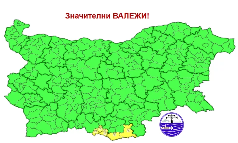 НИМХ обяви жълт код за значителни валежи за крайните южни части на област Смолян и Кърджали утре.