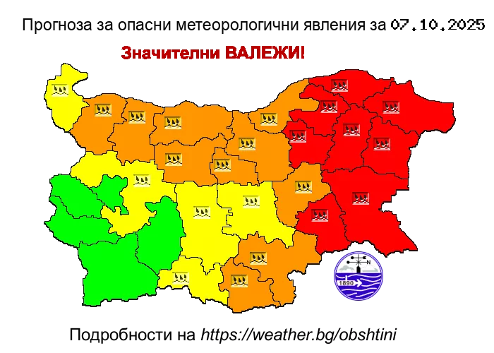 Повишена вероятност за значителни количества валежи е в сила в почти цялата страна днес. Най-съществени ще са в източните и в северните райони от страната. В Източна България е обявен код червено - най-висока степен на опасност от наводнения. Над 65л/кв.м се очаква да паднат за денонощието в тези райони.