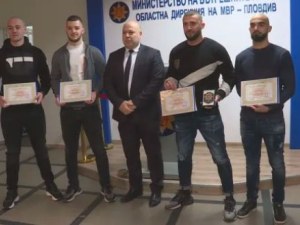 Полицията в Пловдив награди младежите, които задържаха рецидивист след извършен грабеж. 32-годишният престъпник заплашва с нож и ограбва 15-годишно момче на автобусна спирка пред очите на граждани. Удовлетворение и радост са първите емоции на треньора Димитър Желязков, когато приема почетния плакет за гражданска доблест.