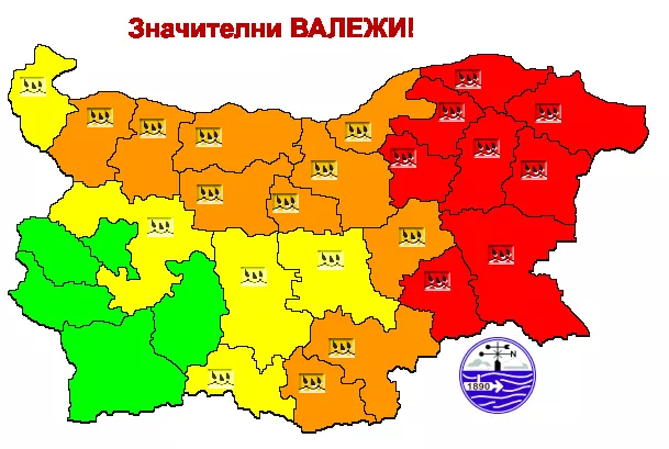 Повишена вероятност за значителни количества валежи има в почти цялата страна. В сила е и предупреждение, в Южната половина опасността е от втора степен - код оранжево, за количества над 65 л/кв.м локално за денонощието.