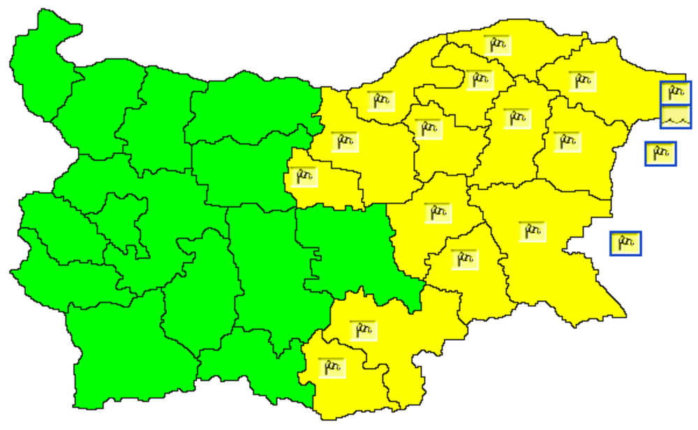 Предупрежденията за силен вятър ще важат за областите Бургас, Варна, Добрич, Силистра, Шумен, Ямбол, Сливен, Търговище, Разград, Русе, Велико Търново, Габрово, Хасково и Кърджали.