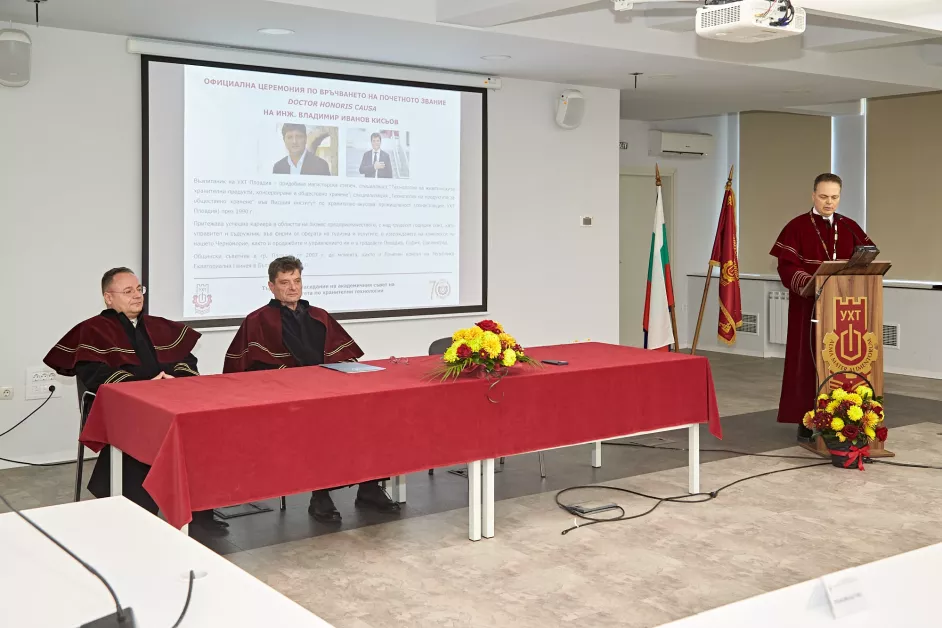 Професор Иво Димитров и инж. Владимир Кисьов бяха удостоени с почетното звание “Доктор хонорис кауза” на Университета по хранителни технологии Пловдив. Това стана на тържествено заседание на Академичния съвет на висшето училище.