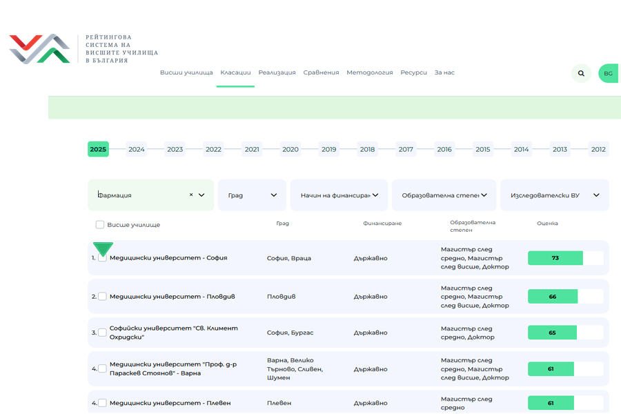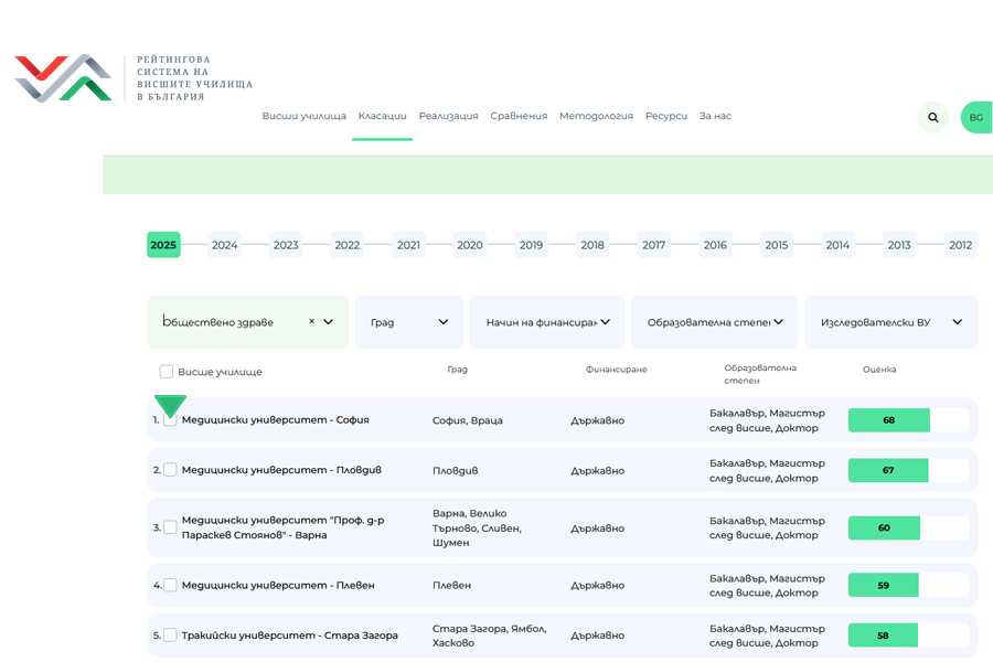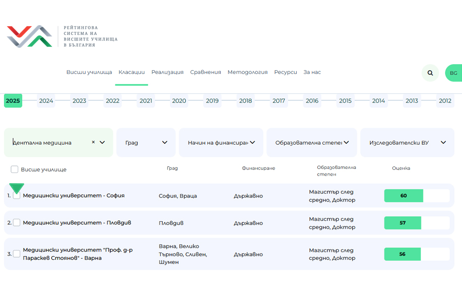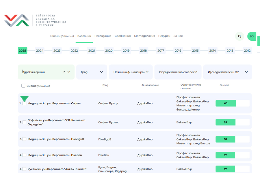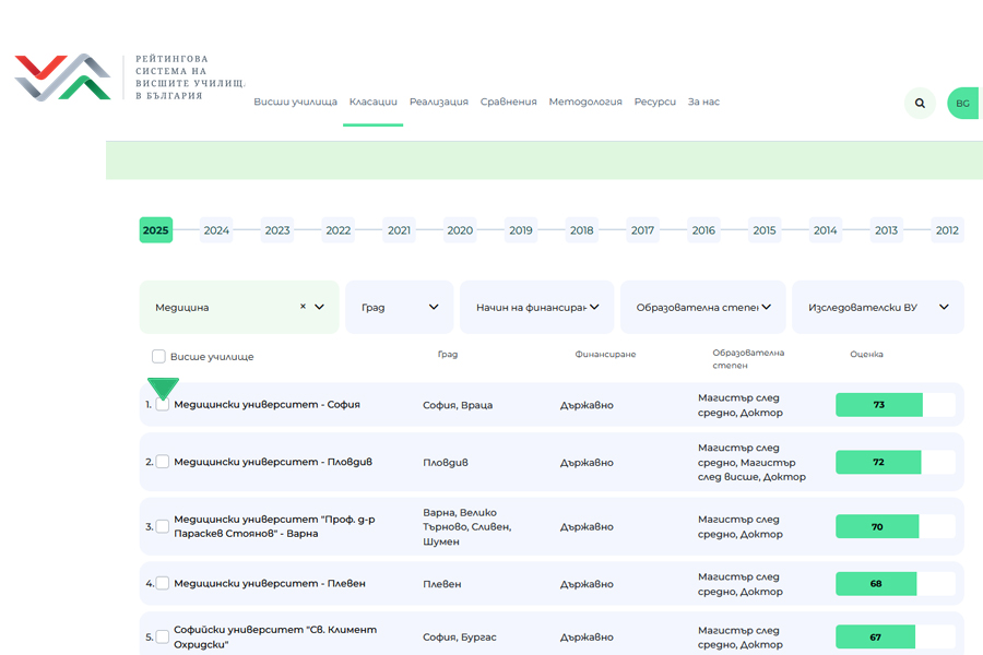 За 14-та поредна година МУ-София заема лидерското място в професионално направление „Медицина“, според Рейтинговата система на висшите училища в България. Данните за 2025-та година бяха изнесени днес от Министерството на образованието и науката.