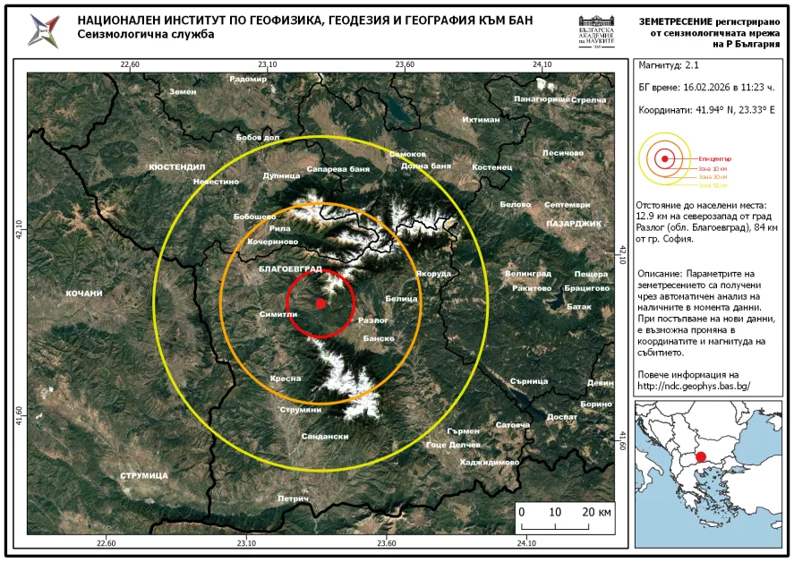 Слабо земетресение е регистрирано в Благоевградско, съобщи НИГГГ към БАН. Трусът с магнитуд 2.1 по Рихтер е станал на 12 км северозападно от Разлог и на 84 км от София. Дълбочината му е 15 км.