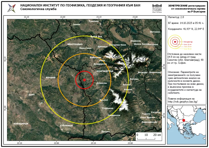 Земетресение с магнитуд 2.8 по Рихтер е регистрирано в ранните часове на 14 октомври в района на Симитли, област Благоевград.