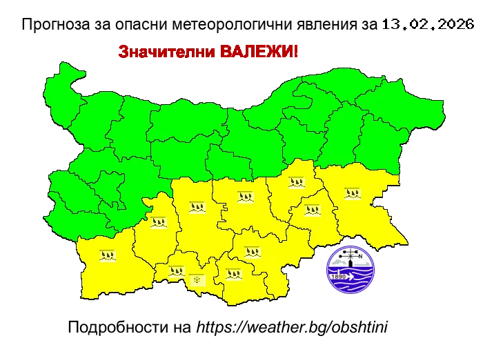 Валежите през деня ще обхванат по-голямата част от страната. Значителни по количество ще бъдат те на много места в южните райони. В югоизточните части от страната ще има и гръмотевична дейност. Ще духа до умерен, в източните райони временно силен вятър от север-североизток, в Дунавската равнина – от запад. В повечето места минималните температури ще бъдат между 0° и 5°, за София – около 2°, максималните – между 5° и 10°, за София – около 7°.