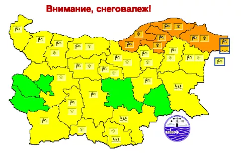 Жълт код за силен вятър е обявен за областите: Благоевград, Видин, Монтана, Пловдив и Сливен. Предупреждение за силен вятър и за сняг и поледици важи за: Варна, Враца, Велико Търново, Габрово, Ловеч, Пазарджик, Плевен, Търговище и Шумен. Жълт код за валежи от дъжд е в сила за областите Бургас и Хасково, за валежи от сняг за София област и за Смолян, а за Кърджали – от сняг и дъжд.