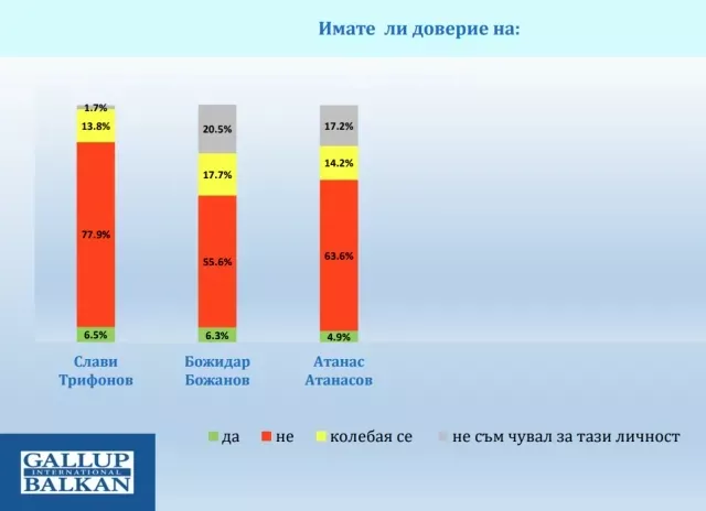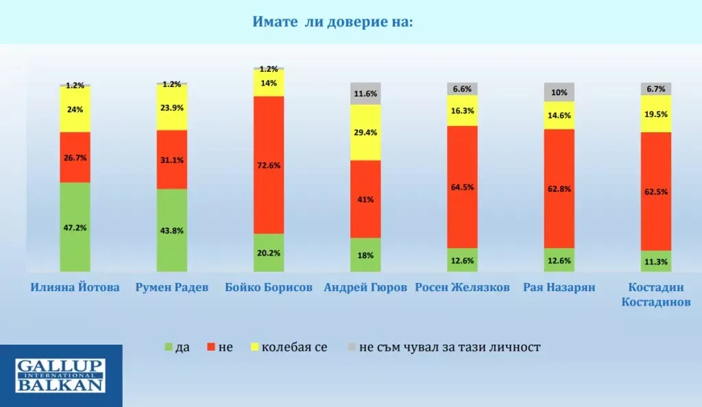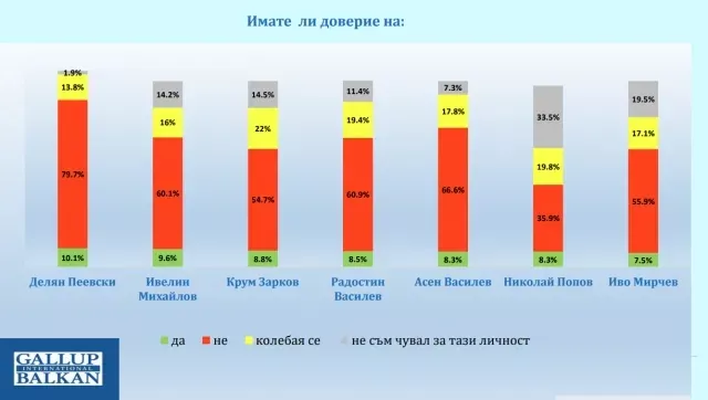 Според проучването на „Галъп“ Делян Пеевски се ползва с 10,1% доверие, Ивелин Михайлов – с 9,6%, председателят на БСП Крум Зарков – с 8,8%, Радостин Василев – с 8,5%, Асен Василев – с 8,3%, Николай Попов – с 8,3%, Ивайло Мирчев – със 7,5%, Слави Трифонов – с 6,5%, Божидар Божанов – с 6,3% и Атанас Атанасов – 4,9%.