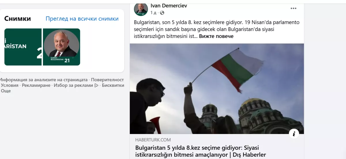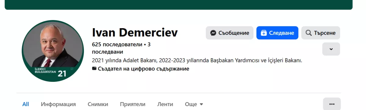 Той е създал нов профил с турска транслитерация на името си – Ivan Demerciev. Най-отгоре стои логото на „Прогресивна България“ с номера на бюлетината, а надписът е преведен на турски – „ilerici Bulgaristan“. Представянето му също е на турски език, като в него изрежда, че е бил правосъден, а след това и вътрешен министър.