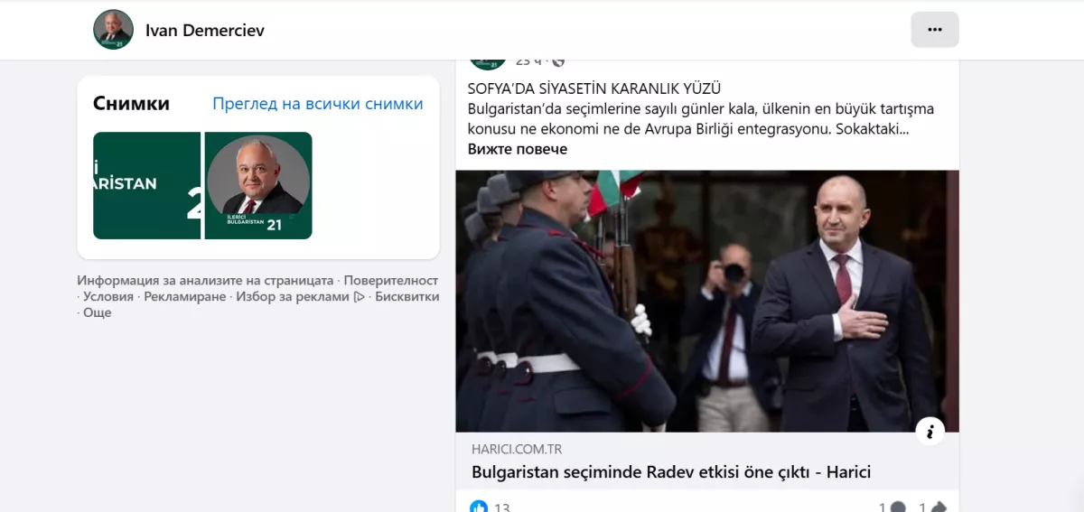 Постовете му са изцяло на турски, а на места се виждат автоматични преводи на Facebook на английски според настройките на отделния потребител. Това, разбира се, не променя оригинала. Не Facebook агитира, а Демерджиев. Той споделя и интервюта пред турски медии, както и срещи с български изселници в южната ни съседка.