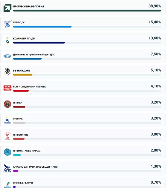Според разпределението на мандатите „Прогресивна България“ (ПБ) получава 111 депутати в новия парламент. ГЕРБ разполага с 43 народни представители, а ПП–ДБ – с 38 депутати. ДПС ще има 23-ма депутати, „Възраждане“ – 14, а БСП – 11 народни представители.