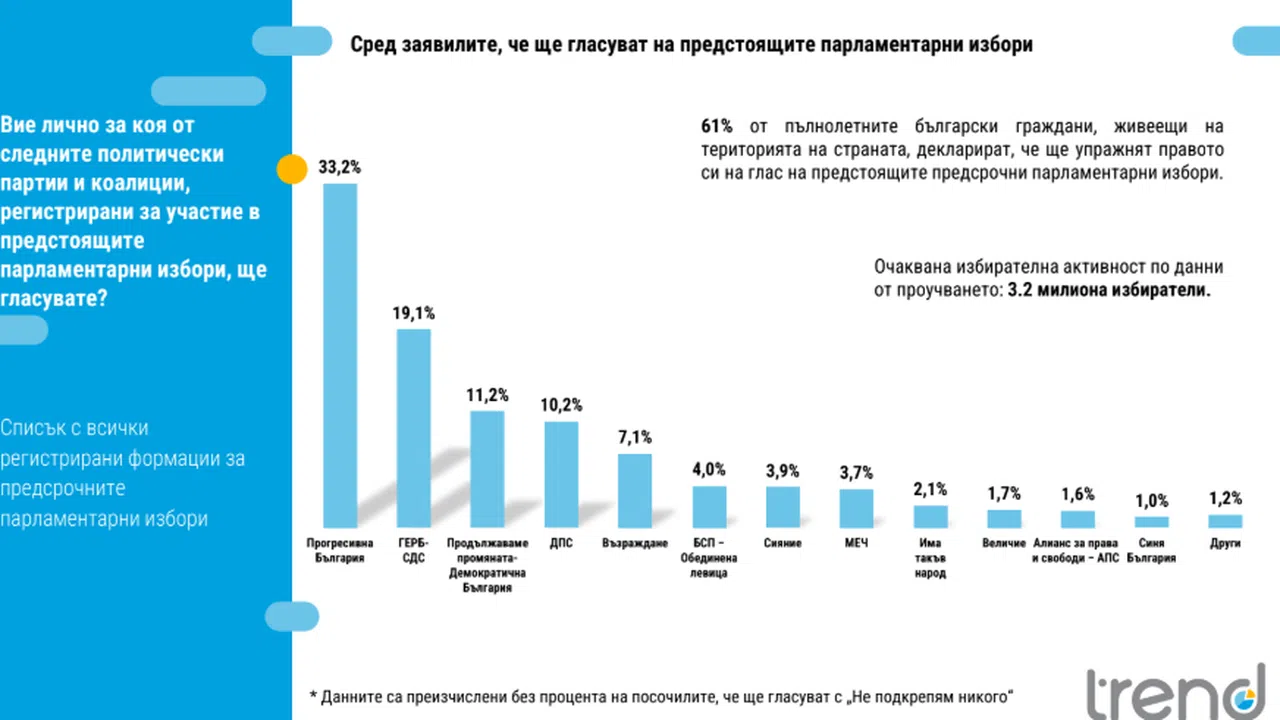 Пет сигурни формации с представителство в следващото Народно събрание, а три са на ръба на бариерата. Предизборната кампания леко повишава активността. Това показват данни от проучване на „Тренд“ по поръчка на „24 часа", посветено на електоралните нагласи спрямо предстоящите предсрочни парламентарни избори. Изследването е реализирано в периода между 13 и 16 април 2026 г. чрез пряко полустандартизирано интервю "лице в лице" с таблет сред 1004 души на възраст 18+.