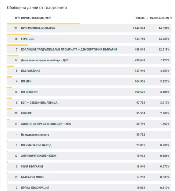 „Прогресивна България“ е първа политическа сила в България с 44.59%, а пет формации минават 4-процентната бариера. Това става ясно при публикуването на 100% обработени данни от изборните секции в сайта на ЦИК.