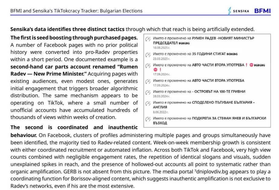 Докладът документира и широкото използване на тактиката "Seed Boosting" – закупуване или превземане на вече съществуващи страници с натрупана аудитория. Фрапантен пример е Facebook страница, първоначално създадена за продажба на авточасти втора употреба, която малко преди изборите е директно преименувана на „Румен Радев – Новият министър-председател“. Придобиването на страници със съществуваща аудитория, дори скромна, генерира първоначално ангажиране, което задейства по-широко алгоритмично разпространение. Същият механизъм изглежда действа и в TikTok, където малък брой неофициални акаунти са натрупали стотици хиляди гледания в рамките на седмици след създаването им.